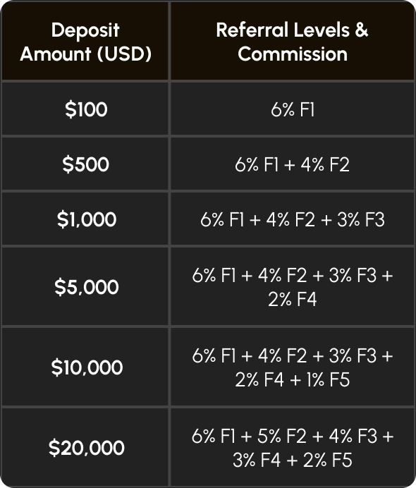 Through your referral link, you can earn 3.5% of your team’s total transaction
